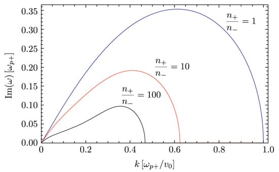 Solutions of Equation (7) for which becomes imaginary describe unstable modes that grow with time, cf. Equation (6). Figure 1 provides exemplary solutions for the growth rate of the resultant kinetic (electron-scale) Kelvin-Helmholtz instability in the case of a simple tangential shear flow profile (i.e., for , and for ) with different density contrast.