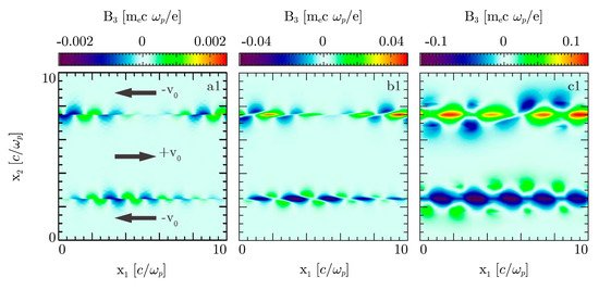 Results of two-dimensional PIC simulations of counter-propagating flows of equal density () and with c, showing the emergence of a dominant DC () magnetic field component along the shear on top of the harmonic structure inferred from the linear fluid regime at times (a1), 45 (b1) and 55 (c1). From Ref. [62].