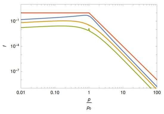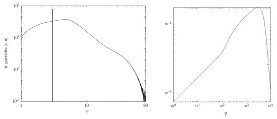 for , with power law index depending on the momentum scaling of the particle mean free path () [48,53,60]. In particular, for a gyro-dependence, , one has , which is comparable to the index for first-order Fermi acceleration at non-relativistic (high Mach number) shocks. The quasi steady-state (time-integrated) particle distribution for continuous injection then becomes constant below , and takes on the noted power-law shape above it.