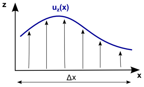 Schematic illustration of a simple two-dimensional velocity shear profile, in which a flow, directed along the z-axis, is characterized by a velocity whose magnitude smoothly varies with the x-coordinate. denotes the shear width.
