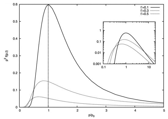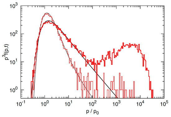 while for , or for a mono-chromatic spectrum , one instead obtains . Analytical solutions of Equation (30) for general momentum indices of can be found in, e.g., Ref. [60]. Monte Carlo simulations of the acceleration of particles in static, homogeneous and isotropic incompressible turbulence have been presented by Ohira [50], confirming the general picture. Figure 10 provides an illustration for turbulent shear particle acceleration in mono-chromatic turbulence.