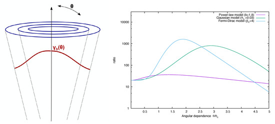 Figure 6. Left: Illustration of a simple conical flow whose radial outflow speeds varies with polar angle . Right: Ratio of viscous shear gain versus adiabatic losses multiplied by (), illustrated assuming a core angle rad and an on-axis flow Lorentz factor . A non-axis preference becomes particularly evident for a Gaussian or Fermi-Dirac shaped flow profile. From Ref. [28].In order to overcome adiabatic losses () and allow for efficient acceleration, relativistic outflow speeds and sufficient energetic seed particles ( for the example shown in Figure 6) would be needed. When put in GRB context, particle acceleration in expanding shear flows might result in a weak and long-duration leptonic emission component in GRBs, as well as be conducive to UHE cosmic-ray production [59]. - (ii) Multi-Component Particle Distributions and Extended Emission:Since (Equation (13)), gradual shear particle acceleration will begin to dominate over conventional first- and second-order Fermi acceleration () above a certain energy threshold. This could naturally result in the formation of multi-component particle distributions. A basic example assuming radiative-loss-limited acceleration in a cylindrical, mildly relativistic shearing flow is shown in Figure 7 [31]. The figure is based on a time-dependent solution of the Fokker-Planck equation for , or equivalently , including the effects of classical second-order Fermi and gradual shear particle acceleration as well as synchrotron losses. Employing a Kolmogorov-type () scaling for the particle mean free path, , and using parameters applicable to mildly relativistic large-scale jets in AGN, electron acceleration up to Lorentz factors of seems feasible (cf. Figure 7 (left)). In the example given, stochastic second-order Fermi acceleration dominates particle energization up to , while above this threshold shear acceleration becomes operative leading to a somewhat flatter spectral slope (with a change by in the example shown). Synchrotron radiation eventually introduces a spectral cut-off at high energies.