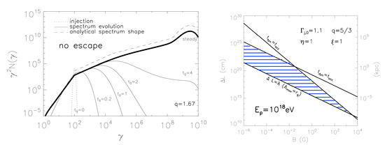 Figure 7. Left: Time-evolution of the electron spectrum, , in the presence of stochastic-shear particle acceleration, where represents a solution of the corresponding Fokker-Planck equation for a linearly decreasing (trans-relativistic) velocity shear of width , and an Alfven speed . Above particle Lorentz factors of a few times the spectrum is shaped by shear acceleration, with a high-energy spectral cut-off around being introduced by synchrotron losses. The successive operation of different acceleration processes here naturally results in a broken-power law distribution. Right: Required (blue-hatched) range of parameters (magnetic field strength B, shear layer width ) to allow shear acceleration of protons to eV given confinement and loss constraints for the noted conditions. The required conditions might be met in large-scale AGN jets. From Ref. [31].As shearing conditions are likely to prevail along astrophysical jets, stochastic-shear particle acceleration is expected to be of relevance for understanding the extended X-ray emission in the large-scale jets of AGN (cf. Section 1) [31]. In reality, the anticipated change in spectral slope will also depend on the spatial transport and escape properties (see below). As a consequence, higher speeds would be needed to achieve comparable, moderate breaks. When put in UHE cosmic-ray context, gradual shear acceleration of protons up to eV seems feasible in the large-scale jets of AGN [31,33,82], cf. also Figure 7 (right). Higher energies might be achieved for faster flows and for heavier particles. - (iii) Incorporating Spatial Transport and Diffusive Escape:In the previous Fokker-Planck approach details of the spatial transport, and possible modifications introduced by the diffusive escape of particles from the system, have not been incorporated. Implications of the spatial transport could in principle be studied by using the full relativistic particle transport Equation (23). Analytical examples in this regard have been recently presented by Webb et al. [33,82]. Focusing on steady-state solutions for a cylindrical jet with longitudinal shear and allowing for a specific radial dependence of the scattering time, , they showed that diffusive escape can counter-act efficient acceleration. In particular, while the local particle distribution still follows a power law , its momentum index becomes dependent on the maximum flow speed on the jet axis, and significantly steepens with decreasing (approaching for ) [33,82]. Though possible limitations due to the chosen -dependence may deserve some further studies, these results imply that efficient gradual shear particle acceleration requires relativistic flow speeds. The analytical solutions [33] can be used to explore the full radial evolution of the particle transport. Figure 8 represents an example for a hyperbolic, relativistic shear flow profile with a maximum Lorentz factor on the jet axis [72].