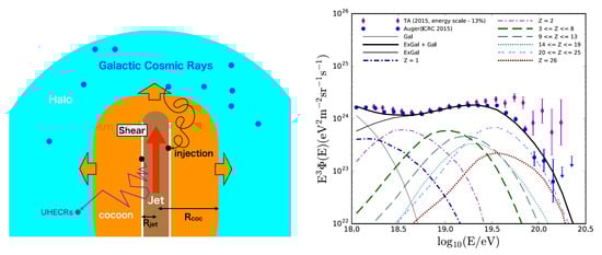 Left: Cartoon of the considered scenario assuming a recycling of galactic cosmic rays by non-gradual shear acceleration in a jet - (turbulent) cocoon system. Some fraction of galactic cosmic rays are considered to be swept up by the kiloparsec-scale jet and reaccelerated to high energies. The return probability of a particle here is dominated by the scattering (turbulence) properties (i.e., particle mean free path) in the cocoon and not in the jet. Right: Reconstruction of the observed UHECR spectrum assuming mildly relativistic (), non-gradual shear acceleration in an extragalactic jet-cocoon system with a thin transition layer pc ( mG, kpc). The composition at the highest end is dominated by intermediate and heavy nuclei. From Ref. [32].