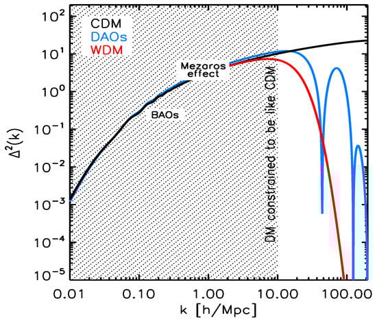 Dimensionless linear dark matter power spectrum in different dark matter models. In the current paradigm, cold dark matter (CDM), the power spectrum keeps on rising to well below subgalactic scales. Alternative models such as warm dark matter (WDM) or interacting dark matter (DAOs) have a cutoff at or slightly below galactic scales, which determines the abundance and structure of small-mass dark matter haloes and subhaloes and the galaxies within. In the black hashed area, the dark matter is constrained by the observed large-scale distribution of galaxies (e.g., [30,31]) and the Ly- forest constraints on WDM [28] to behave as CDM. Figure adapted from [32].