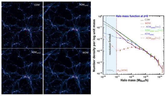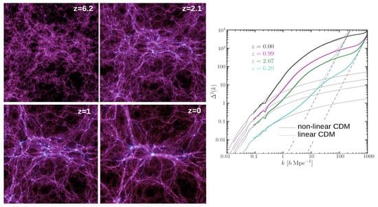 The procedure illustrated in Figure 2 for CDM can be readily applied to other dark matter models with different initial power spectra. In fact, in models where dark matter only behaves differently from CDM at very early times, e.g., in thermal-relic WDM models, it is the different initial conditions (the lack of power on small scales in WDM relative to CDM in the linear regime) that gives rise to the main differences between these models (since the residual thermal motions in WDM models of interest are negligible (see e.g., [73]). In models with a truncated initial power spectrum, the subsequent evolution is affected by particle discreteness in the reconstruction of the density field which introduces an irreducible (shot-noise) power. This results in spurious clustering on scales close to the cutoff length [74] that requires careful treatment to either remove small-scale artificial clumps [75] or avoid their formation altogether by using non-standard simulation techniques [45,76].