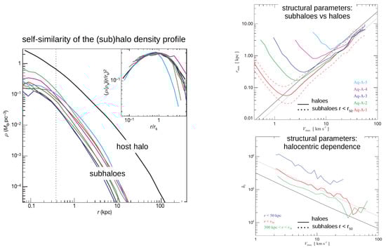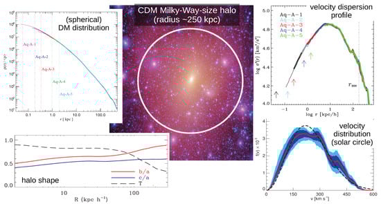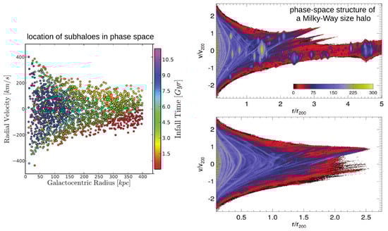 where is the gravitational potential related to the density by Poisson’s equation, is the radial velocity dispersion profile, and is the velocity anisotropy profile, which quantifies the degree of anisotropy of the particle orbits in the dark matter halo. Haloes tend to be isotropic only in their centers and are radially anisotropic in their outskirts [121,142], with a velocity anisotropy that is related to the logarithmic slope of the density profile [143]. The velocity structure of dark matter haloes in equilibrium is thus intimately linked to their spatial distribution (see top right panel of Figure 6), which is strikingly evident in the so-called pseudo-phase-space density, , where is the square of the 3D velocity dispersion. This quantity has been found to be an almost perfect power law, , over several orders of magnitude [121,144], and is in remarkable agreement with the self-similar solution for infall onto a point mass in an Einstein-de Sitter universe [145]. The radial behavior of Q is a manifestation of the nearly universal structure of dark matter haloes, which connects both their spatial and kinematical distributions.