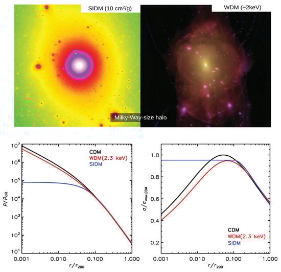 In models with a galactic-scale cutoff in the primordial power spectrum, such as WDM and interacting DM, the main changes can be understood from the later collapse of the first generation of haloes in these models compared to CDM. In contrast to CDM, these galactic-size haloes are not formed hierarchically from the assembly of smaller haloes but, instead, by monolithic collapse. Their characteristic density therefore reflects the mean background density at the time of the monolithic collapse. By contrast, a CDM halo of the same mass forms from the assembly of smaller fragments that typically formed earlier and are therefore denser. Simulations of WDM models have characterized the spatial structure of WDM haloes quite accurately, showing that the density profiles of allowed models are, in fact, well described by the NFW profile but with a lower concentration at a given mass [75,112,154,155,156,157]. The concentration-mass relation for WDM haloes can then be modeled in an analogous way to CDM, but taking into account the cutoff in the power spectrum [158] which is therefore reflected in the concentration of the haloes. An example of this is shown in the bottom left panel of Figure 7, where the density profile of a CDM halo is mapped into that of a 2.3 keV thermal relic WDM halo by simply scaling down the concentration using Equation (39) of Reference [157], which connects the concentration to the cutoff scale in the power spectrum28. This lower concentration is also reflected in the velocity dispersion profile (see bottom-right panel of Figure 7).