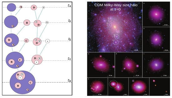 Dark matter subhaloes. Left: schematic representation of a dark matter halo merger tree (taken from [176]30) at discrete redshifts. In a hierarchical model, haloes grow by the accretion of smaller neighboring haloes (A,B,C,D), which become subhaloes at the time when they first cross the virial radius of the host halo. The main branch of the tree represents the evolution of the main progenitor (shown in blue). Since this process occurs across the entire hierarchy of structures, there are subhaloes within subhaloes (sub-subhaloes; like a, b, c in system D) and so on. Right: a simulated Milky Way-size CDM halo from the Aquarius project (figure taken from [138]31; this is the same halo illustrated in Figure 6). The circles in the main image mark six subhaloes that are shown enlarged in the surrounding panels, as indicated by the labels. Sub-subhaloes are clearly visible (corresponding to the configuration illustrated in the last step, , in the left panel). The bottom row shows several generations of sub-subhaloes contained within subhalo f.