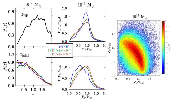 Distribution of accretion times and orbital properties—Equation (12) can be used to compute the average number of haloes that become subhaloes of a host at a given redshift in a certain mass range. Halo merger trees can be used to compute other statistics of the subhalo population that are directly linked to their subsequent evolution, specifically: (i) the distribution of accretion (or infall) times, and (ii) the distribution of orbital properties at the time of accretion. In a time-independent spherical potential only two variables are needed to specify the orbit of a tracer particle (plus the orientation of the orbit). Although subhaloes orbiting a host halo are far from this idealized case, it is nevertheless useful to describe the initial orbital parameters in this way since this provides a point of comparison with the simple spherical potential. These two parameters can be chosen to be the radial, , and tangential, , velocities of the subhalo at the time of infall [184], typically expressed in terms of the virial velocity of the host halo, . Another common choice is to characterize the orbital properties at infall in terms of a circular orbit of the same energy, E, and the same magnitude of the angular momentum, j [185]. The initial orbit is then defined by the circularity, , and the infall radius, , at the time of accretion32.