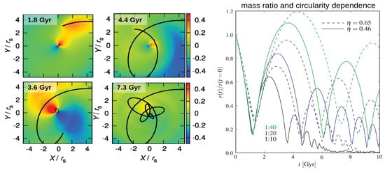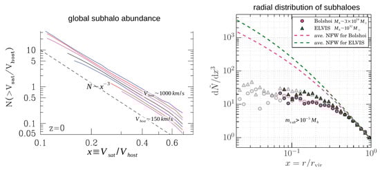 When does a halo become a subhalo? We mentioned earlier that the boundary of a halo is not sharply defined, but rather chosen approximately to separate the region within which the dark matter is in dynamical equilibrium from an outer region where the dark matter is still mostly infalling. In a similar way, the moment at which a halo becomes a subhalo, i.e., when it crosses this transition region for the first time, is somewhat arbitrary. For simplicity, it is common to use the virial radius, e.g., , as the boundary of the halo and thus, to define a subhalo as a halo that has crossed the virial radius of a larger halo at some point in the past (see left panel of Figure 8). One could argue for a more physical definition, based for instance on the relevance of the tidal forces exerted by the dominant halo host in the local environment but, for simplicity, and because of its common usage, we will use the former, simple definition of a subhalo. We should remark that it is not uncommon for subhaloes to leave the boundary of the main halo at some point after first crossing [173,174,175], and thus, the subhalo population today extends to radii a few times the current virial radius ([175]; those systems beyond the virial radius are commonly known as backsplash haloes [173]).