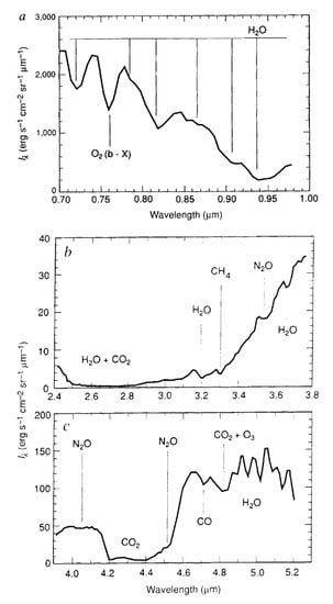 The first remote observation of biosignatures could be considered the UV, visible and NIR spectra of the Earth obtained by the probe Galileo in its fly towards Jupiter in the 1990. Sagan et al. [] analyzed those spectra searching for signatures of life. In the spectra of the Near–Infrared Mapping Spectrometer (NIMS, []) they found a large amount of O and the simultaneous presence of CH traces concluding that this co–presence is strongly suggestive of life (see Figure 1).