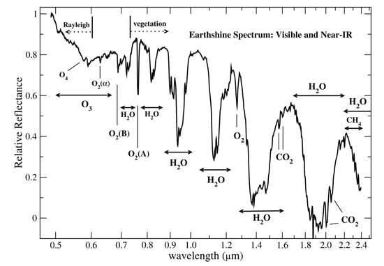 Observed Vis-NIR spectrum of the Earthshine obtained by []. The reflectivity of vegetation is dominated by a sharp rise in reflectivity for wavelengths longer than 0.70 m, plus some smaller bumps at shorter and longer wavelengths [,]). In the spectrum, the rise of the flux due to plants reflection is only about 6% of the nearby continuum. This is because at the time of observation only about 17% of the projected area was land (for details on the observing method see []. In the spectrum are also indicated most of the molecules that are addressed in the text.
