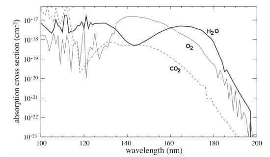 - Domagal-Goldman, S.D.; Segura, A.; Claire, M.W.; Robinson, T.D.; Meadows, V.S. Abiotic Ozone and Oxygen in Atmospheres Similar to Prebiotic Earth. Astrophys. J. 2014, 792, 90. [Google Scholar] [CrossRef]