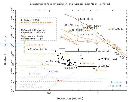 - Douglas, E.S.; Carlton, A.K.; Cahoy, K.L.; Kasdin, N.J.; Turnbull, M.; Macintosh, B. WFIRST Coronagraph Technology Requirements: Status Update and Systems Engineering Approach. In Society of Photo-Optical Instrumentation Engineers (SPIE) Conference Series; SPIE: Bellingham, WA, USA, 2018; Volume 10705, p. 1070526. [Google Scholar] [CrossRef]