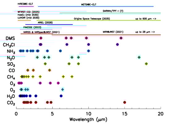 Other gases that could be considered bioindicators are, for example, SO and HS. This is a gas mixture produced by volcanism and out of thermodynamic equilibrium at terrestrial surface conditions. The reactions between the two will form water and elemental sulfur. Detecting both HS and SO in an exoplanet atmosphere could therefore be either a sign of life or just a sign of volcanism []. Other bioindicators reported by several authors include ethane (a hydrocarbon compound) from biogenic sulfur gases [] and hazes generated from CH [].