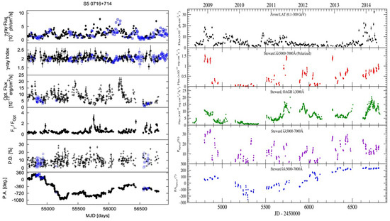 Two examples of long-term optical and -ray monitoring with optical polarization signatures. (Left): Observations of the blazar S5 0716+71 from 2008–2014. The top panel shows the gamma-ray light curve, the second panel shows variability of the gamma-ray spectral index, the third panel shows the optical V-band light curve, the fourth panel shows the ratio of gamma-ray to optical flux, the fifth panel shows variability of the polarization degree, and the bottom panel shows variability of the polarization angle. The figure is reproduced from Figure 1 in [58] with the permission of the American Astronomical Society (AAS). (Right): Observations of the blazar 3C 279 from 2008–2014. The temporal behaviors of the polarimetric observations (P, PA, polarized flux) compared with the gamma-rays and the UV-continuum for 3C 279. The figure is reproduced from Figure 4 in [64].