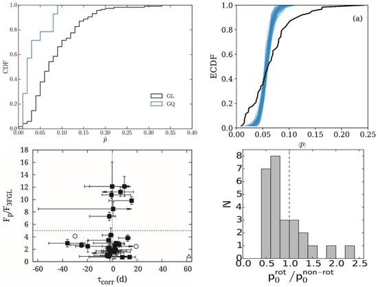 Statistical studies of the RoboPol data. (Upper left): gamma-ray-loud (GL) blazars show a systematically higher polarization degree than the gamma-ray-quiet (GQ) ones. The figure is reproduced from Figure 1 in [74]. (Upper right): observed polarization degree distribution (black line) versus random walk simulations (blue lines). Figure reproduced from Figure 15 in [78]. (Lower left): normalized gamma-ray flare level versus time lag between gamma-ray flare and polarization angle rotation. Figure reproduced from Figure 5 in [73]. (Lower right): the distribution of the ratio of polarization degree during angle rotation over that outside the angle rotation. Figure reproduced from Figure 9 in [80].