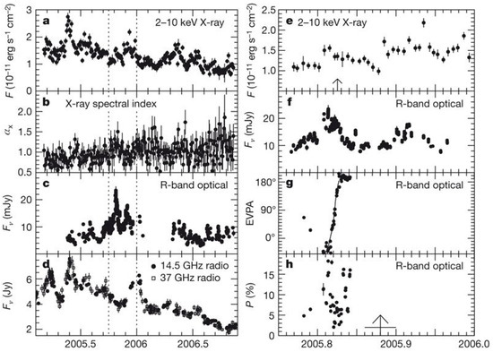 Observations of BL Lac showing multi-wavelength flares with an optical polarization angle swing. (a–d), dependence on time of the flux of radiation from BL Lac over a two-year interval at the indicated wavebands. (e–h), enlargements of the 0.25 yr time interval marked by vertical dotted lines in panels (a–d) but with optical R-band polarization angle (g) and degree of polarization P (h) respectively replacing the X-ray spectral index (b) and radio flux density (d) (whereas e and f, respectively, show the magnified intervals in (a,c)). The figure is reproduced from Figure 2 in [44] with permission from Nature.