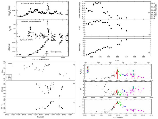 The polarization angle usually shows small erratic fluctuations. Sometimes it can continuously rotate in one direction, and in very rare cases, it can swing ∼180 or even beyond that. Such events were first discovered simultaneously with multi-wavelength blazar flares in ([44,81], see Figure 3), indicating major changes in the magnetic field during flares. Notice that [81] does not include Steward Observatory data in the analysis. By including those data, the polarization angle swing is not present. Since the polarization angle has the ambiguity, it requires close sampling of data points to establish a polarization angle swing. Recent optical polarization monitoring programs have collected a large number of polarization angle data and demonstrated that such swings can be present in a number of blazars (see, e.g., [46,58,65,75]).