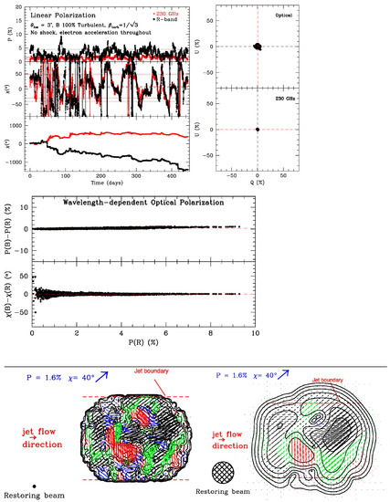 - Peirson, A.L.; Romani, R.W. The Polarization Behavior of Relativistic Synchrotron Jets. Astrophys. J. 2018, 864, 140. [Google Scholar] [CrossRef]
