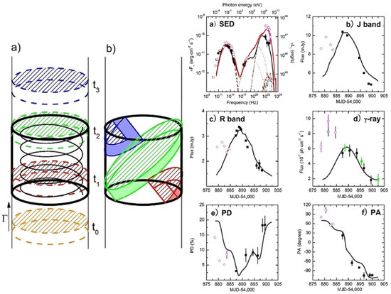 - Marscher, A.P.; Jorstad, S.G.; D’Arcangelo, F.D.; Smith, P.S.; Williams, G.G.; Larionov, V.M.; Oh, H.; Olmstead, A.R.; Aller, M.F.; Aller, H.D.; et al. The inner jet of an active galactic nucleus as revealed by a radio-to-γ-ray outburst. Nature 2008, 452, 966–969. [Google Scholar] [CrossRef] [PubMed]