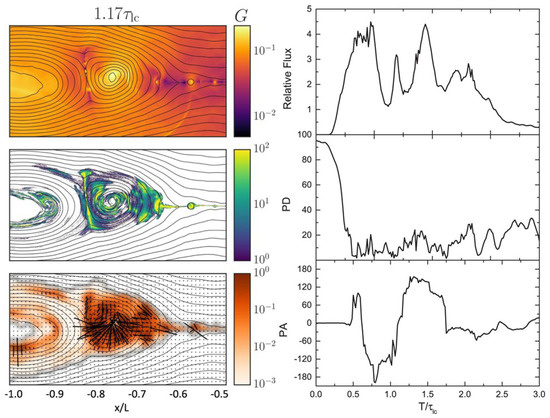 Magnetic reconnection can efficiently dissipate magnetic energy to accelerate particles [49,50,101]. In recent years, it has been well studied, both analytically and numerically, that magnetic reconnection can explain the blazar spectra and light curves [88,102,103,104,105]. Recently, [106] has combined PIC with polarized radiation transfer simulations to study the polarization signatures during reconnection. Very interestingly, magnetic reconnection can make strong polarization angle swings (see Figure 8). The idea is that the large plasmoids generated in the reconnection layer can merge into each other and trigger secondary reconnection. This leads to additional particle acceleration where the accelerated particles can stream along the magnetic field lines in the plasmoids, giving rise to polarization angle swings. The rotating angle appears to be in the unit of ∼, and it can extend well beyond . Additionally, the polarization angle can rotate in either direction. During the swings, the polarization degree usually drops, and there are always flares due to the particle acceleration. This model shows promising features consistent with current observations, but it still needs further examination to test its robustness.