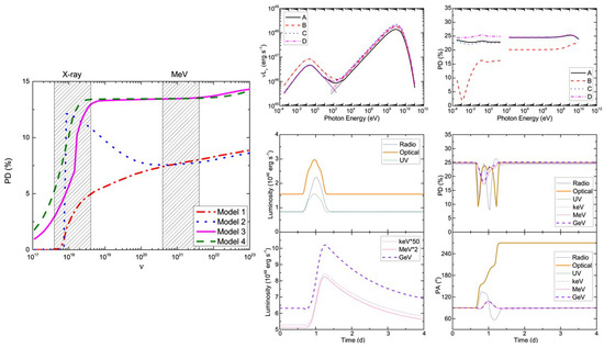 Predictions of the spectral and temporal high-energy polarization signatures. (Left): The X-ray to -ray spectral polarization degree based on the spectral fitting of the TXS 0506+056 observation. The optical polarization degree is taken as 10%. The spectral models 1–4 are the pure leptonic model, leptonic model with a hadronic cascade component, proton synchrotron model with a considerable hadronic cascade component, and proton-synchrotron-dominated model. The shaded regions correspond to the X-ray and MeV -ray bands. The figure is reproduced from Figure 2 in [107] with the permission of the American Astronomical Society (AAS). (Right): The spectra, light curves, and polarization signatures of the proton-synchrotron-dominated model. The A–D epochs in the upper panels correspond to the spectra and spectral polarization degree before the -ray flare, during the rising phase, at the flare peak, and after the flare. This figure is reproduced from Figure 4 in [109] with permission from the American Astronomical Society (AAS).