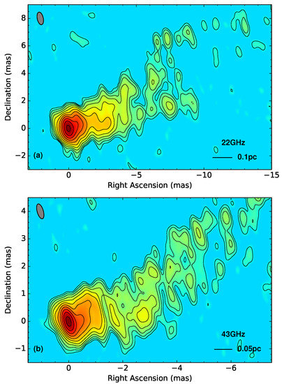 - Croke, S.M.; Gabuzda, D.C. Aligning VLBI images of active galactic nuclei at different frequencies. Mon. Not. R. Astron. Soc. 2008, 386, 619. [Google Scholar] [CrossRef]