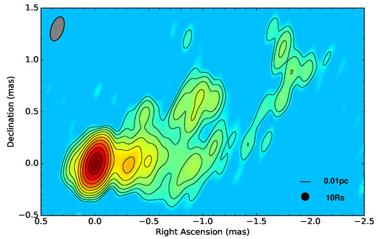 - Hada, K.; Kino, M.; Doi, A.; Nagai, H.; Honma, M.; Hagiwara, Y.; Giroletti, M.; Giovannini, G.; Kawaguchi, N. The Innermost Collimation Structure of the M87 Jet Down to 10 Schwarzschild Radii. Astrophys. J. 2013, 775, 70. [Google Scholar] [CrossRef]