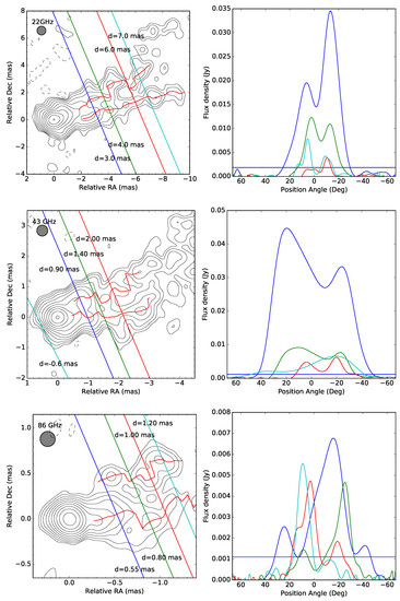 In this part, we use intensity slices to extract details of the jet and to analyze the transverse jet structure evolving with core distance d. To improve the angular resolution in the direction transverse to the jet with the least distortion of the images, in advance of slicing, we restored the images with circular Gaussian beams whose diameter equal to the geometric mean of the length of major and minor axis of their synthesized beams, which is 0.65, 0.36 and 0.17 mas for the image at 22, 43 and 86 GHz respectively. The restored images are shown as contours in the left panels of Figure 3. Then we slice the restored images in a direction perpendicular to the approximate overall jet axis, which is respect to the north (referred as “jet axis” hereafter). For the 22 GHz image, we made slices between 2.00 and 10.00 mas, at an interval of 0.05 mas; for the 43 GHz image, we made slices between d = 0.10 and 3.00 mas, at an interval of 0.05 mas; for the 86 GHz image, we made slices between d = 0.10 and 1.40 mas, at an interval of 0.01 mas. The right panels of Figure 3 present the sample slices, showing the intensity as a function of position angles referring to the jet axis (, the northern limb is at positive values, while its southern counterpart is at negative values). Locations of these sample slices are presented as lines superimposed on the contours in the left panels of Figure 3.