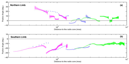 (a) Position angles of the northern limb in M87 as functions of core distance d. (b) Position angles of the southern limb in M87 as functions of core distance d. The colors represent the measured frequencies, magenta for 86 GHz, blue for 43 GHz and green for 22 GHz. The uncertainty of is estimated as , in which is a typical width of the jet limb, and SNR is the ratio between the intensity peak and the of images. only peaks with intensity above 5 are presented to make sure the result is reliable.