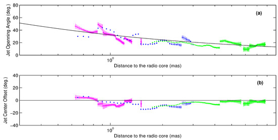 In the following analysis, we move the jet structure measured at 86 GHz outward for 0.15 mas, and the structure measured at 22 GHz inward for 0.25 mas to eliminate the effect brought by different angular resolutions. We define the apparent jet opening angle as the difference of of two limbs. The panel (a) of Figure 5 shows as a function of d. The parabolic collimation profile, , determined by [11,12], is also presented for reference. The overall jet generally evolves around the parabolic profile, but some local structural features are clearly seen. So we divide the jet into six segments, and each segment includes an expansion and a following recollimation: segment 1 includes an quick expansion between d = 0.75 and 0.90 mas, followed by a gradual recollimation between 0.90 and 1.30 mas; segment 2 includes an expansion between 1.30 and 1.45 mas, followed by a quick recollimation between 1.45 and 1.50 mas; segment 3 includes an gradual expansion between 1.50 and 2.00 mas, followed by a gradual recollimation between 2.00 and 2.55 mas; segment 4 includes a quick expansion between d = 2.55 and 2.60 mas, followed by a slow recollimation between 2.60 and 3.35 mas; segment 5 includes an expansion between d = 3.35 and 3.65 mas, followed by a gradual recollimation between 3.65 and 4.25 mas; segment 6 includes an expansion between 4.25 and 4.60 mas, followed by a recollimation beyond 4.60 mas. We define the apparent offset of jet center as the arithmetic average of the of two jet limbs as well. The panel (b) of Figure 5 shows as a function of d, and the jet axis is presented as a black solid line for reference. As the Figure shows, the jet bends southward since 0.75 mas, the offset reaches its maximum at 1.45 mas (where it is most clearly seen on the 43 GHz image), where the northern limb veers south, and gradually returns to zero around 3.00 mas.