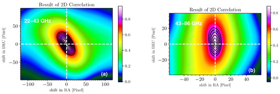Panel (a) shows 2D cross-correlation of the optically thin regions of 22 and 43 GHz images. Panel (b) 2D cross-correlation of the optically thin regions of 43 and 86 GHz images.