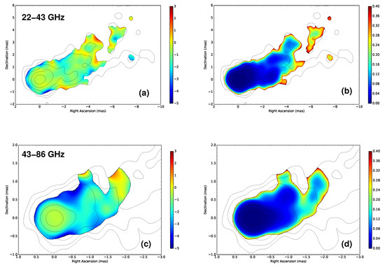 In this part, we present the spectral-index distribution in the jet calculating between 22 and 43 GHz. To align the VLBI images at different frequencies, we employ an algorithm which is first introduced by [15]. It is based on the premise that the positions of optically thin regions to synchrotron radiation are not affected by absorption effects, then images can be aligned by finding out the maximum of 2D cross-correlation of the optically thin regions. This method is now commonly used [16,17,18] and was once employed by [19] to obtained the RM map of jet in M87.