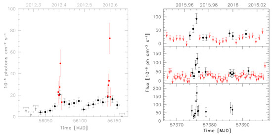 Left panel: LAT light curve of SBS 0846+513 in the 0.1–100 GeV energy range during 1 April–28 August 2012 with 7 days or 1 day (shown as red squares) time bins. Adapted from [38]. Right panel: LAT light curve of PKS 1502+036 in the 0.1–300 GeV energy range during 11 December 2015–9 January 2016, with 1-d time bins (top panel), 12-h time bins (middle panel), and 6-h time bins (bottom panel). Adapted from [62]. In both panels arrow refers to 2- upper limits. Upper limits are computed when < 10.