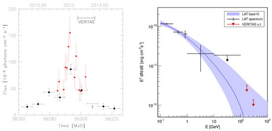 Left panel: LAT light curve of PMN J0948+0022 in the 0.1–100 GeV energy range during 1 December 2012–31 January 2013, with 7-day time bins. Red solid squares represent daily fluxes reported for the period of high activity. The horizontal line indicates the period of the VERITAS observation. Adapted from [61]. Right panel: SED of PMN J0948+0022 in the MeV-to-TeV energy range. The LAT spectrum was extrapolated to the TeV energies and corrected for EBL absorption using the model of [93]. Fermi-LAT and VERITAS data points and upper limits are shown. Adapted from [61]. In both panels, arrow refers to 2- upper limits. Upper limits are computed when < 10.