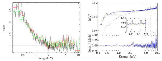 Left panel: XMM-Newton EPIC pn (black), MOS1 (red), and MOS2 (green) data of PMN J0948+0022 collected on 28–29 May 2011 shown as a ratio to a power law with photon index = 1.48. Adapted from [103]. Right panel: data/model ratio for the XMM-Newton EPIC pn X-ray spectrum of 1H 0323+342 collected on 23–24 August 2015. A model including two power-laws and two Gaussian Iron emission lines with the Galactic value in the direction of the source fixed to N = 2.33 × 10 cm is applied to the data. Adapted from [98].