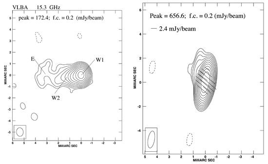- Piner, B.G.; Pant, N.; Edwards, P.G. The Jets of TeV Blazars at Higher Resolution: 43 GHz and Polarimetric VLBA Observations from 2005 to 2009. Astrophys. J. 2010, 723, 1150. [Google Scholar] [CrossRef]