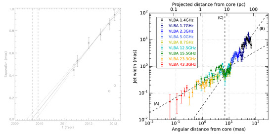 Left panel: The separation between the core component of SBS 0846+513 and the knot ejected in 2009 as a function of time. The solid line represents the regression fit to the 15 GHz VLBA MOJAVE data, while the dotted lines represent the uncertainties from the fit parameters. Dashed lines indicate the beginning and the peak of the radio flare observed by OVRO in 2009. Adapted from [38]. Right panel: Jet width profile of 1H 0323+342 as a function of (projected) distance z from the 43 GHz core. The dashed line (A) represents a best-fit model for the inner jet (z < 6.5 mas), indicating a parabolic collimating jet. The dashed line (B) represents a best-fit model for the outer (z > 7.5 mas) jet, indicating a hyperbolic expanding jet. The vertical dashed line (C) indicates the location of the quasi-stationary feature S. Adapted from [143].