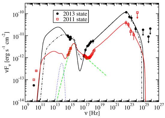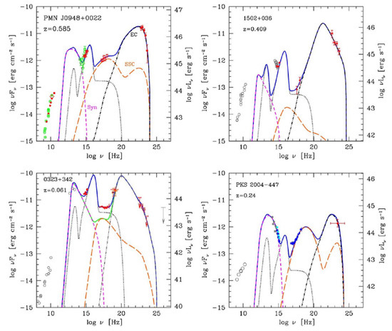 For PMN J0948+0022 the broad-band SED of the 2013 flaring activity state has been compared with that from an intermediate activity state observed in 2011 in [103] (Figure 8). Contrary to what was observed for some FSRQ (e.g., PKS 0537−441; [164]) the SED of the two activity states, modelled as synchrotron emission and external Compton scattering of seed photons from a dust torus, could not be modelled by changing only the electron distribution parameters. A higher magnetic field is needed for the high activity state, consistent with the modelling of different activity states of the FSRQ PKS 0208−512 [165]. The 2013 flaring state has been modelled also assuming external Compton scattering of BLR photons. The model reproduces the data as well as the scattering of the IR torus photons, but requires magnetic fields which are far from equipartition [61]. On the other hand, external Compton scattering of BLR photons has been proposed as main mechanism for producing the high-energy emission in case of the first -ray flare observed by the same source in July 2010 [63]. In the same way, the -ray emission from 1H 0323+342 has been modelled with external Compton scattering of BLR photons. For this source a significant contribution from the X-ray corona has been taken into account to describe the X-ray part of the SED, at least during some periods [64,98].