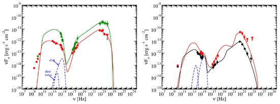The comparison of the SED of SBS 0846+513 during the flaring state in May 2012 with the SED built during a quiescent state is shown in the left panel of Figure 9. Similar to the case of PMN J0948+0022, the SED of the two different activity states, modelled by external Compton scattering of seed photons from a dust torus, could be fitted by changing the electron distribution parameters as well as the magnetic field [147]. A significant shift of the synchrotron peak to higher frequencies was observed during May 2012 flaring episode, similar to what has been observed in some FSRQ (e.g., PKS 1510−089, CTA 102; [166,167]). On the other hand, contrary to what was observed for PMN J0948+0022, no significant evidence of thermal emission from the accretion disc has been observed in SBS 0846+513.