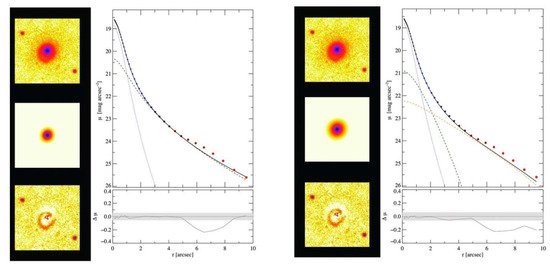 Two-dimensional surface-brightness profile decomposition of 1H 0323+342 in J-band for Model A (PSF+Bulge; left panel) and Model B (PSF+Bulge+Disc; right panel). Top left subpanel: the observed image in a field of view of 20 arcsec × 20 arcsec. Middle left subpanel: model used to describe the surface brightness distribution. Bottom left subpanel: the residual image. Top right subpanel: radial profile of the surface brightness distribution. The filled circles show the observations, and the solid, pointed, and dashed lines represent the model, PSF, and host galaxy, respectively. The exponential disk component is shown in orange. Bottom right subpanel: residuals. Adapted from [181].