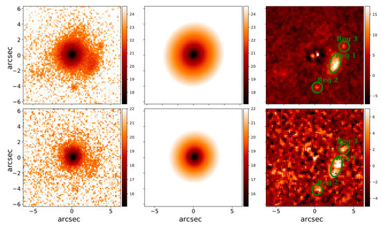 Left panels: central 13 × 13 arcsec of the images in the J and band of PKS 1502+036, top and bottom, respectively. Center panels: GALFIT models using a Sérsic profile combined with a nuclear PSF. Right panels: residual images after subtracting the model. Colour bars are in mag arcsec (left-hand and centre panels). Adapted from [179].