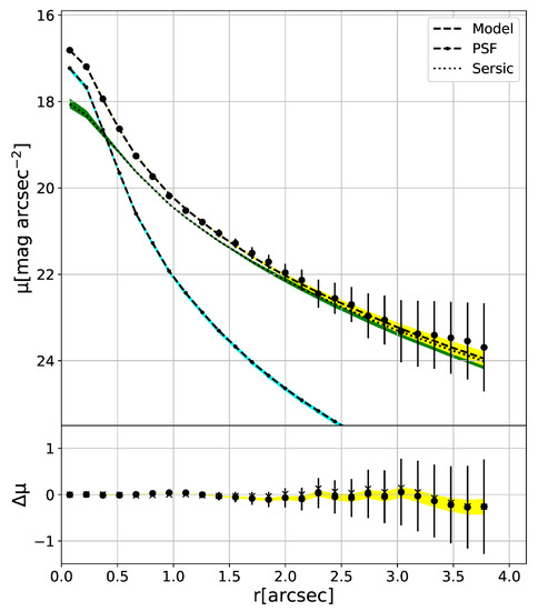 Surface brightness decomposition in the J-band of PKS 1502+036. The observed profiles are the black dots, the nuclear PSF is the dot–dashed light blue curve, the bulge component is reproduced with a Sérsic model (green dot line). In the bottom panels the residuals are shown. In the residual panel crosses represent bulge + disc component. Adapted from [179].