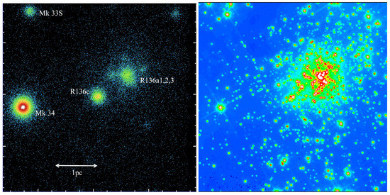 (left) Chandra ACIS X-ray logarithmic intensity image of the core of NGC 2070 from T-ReX, centred on R136c, adapted from [38], showing the relative brightness of the colliding wind binary Melnick 34 (WNh5 + WN5h) [37] to the R136a star cluster (hosting multiple WN5h stars) and R136c (WN5h+?); (right) HST WFC3/F555W logarithmic intensity image of the same 19 × 19 arcsec region, highlighting the rich stellar population of R136a with respect to R136c and Melnick 34.