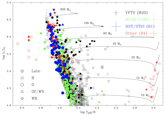 Figure 3 presents the HR diagram of the Tarantula Nebula, comprising single star results from VFTS [50,51,52,53,54], VLT/MUSE [11], HST/STIS [55] and literature results for other stars within 160 parsec of R136, including Wolf-Rayet stars [56]. Results for binary systems have been incorporated, primarily drawn from [57] for VFTS B-type binaries, Tarantula Massive Binary Monitoring (TMBM) for VFTS O-type binaries [58] and recent literature for WR stars [37,59]. Evolutionary tracks for non-rotating, LMC metallicity massive stars up to the onset of He-burning have been included for reference [60,61]. Over 1170 massive stars have been included, revealing a well populated main sequence population up to ∼, plus classical Wolf-Rayet stars to the left of the main sequence, and evolved blue supergiants up to , and cool supergiants, up to 5.3 [48]. The addition of all luminous early-type stars from R136 and NGC 2070 fills in the extreme upper main sequence which is somewhat under populated from VFTS alone [40]. The overwhelming majority of the older massive stellar population—i.e., evolved stars with masses below —are spatially exterior to NGC 2070 (open symbols), although NGC 2070 is host to one luminous M supergiant, Melnick 9. Conversely, beyond NGC 2070, the main-sequence population at the highest stellar masses is relatively underpopulated, albeit with several WN5h stars (R146, R147) and early O stars (VFTS 16, BI 253) located 95 ± 25 parsec from R136.