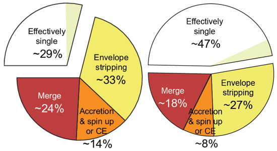 Pie charts, courtesy Hugues Sana and Selma de Mink, illustrating the fraction of O stars undergoing single stellar evolution versus mergers, primaries being stripped of their envelopes, and secondaries being spun up, for Milky Way young clusters (left) and VFTS O stars (right), adapted from [63,64].
