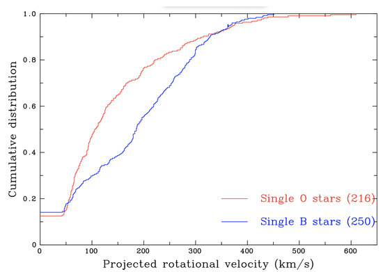 Cumulative distribution of rotational rates for single VFTS O (red) and B stars (blue) [69,71].