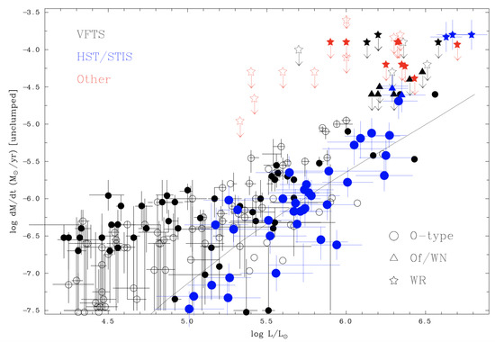 Unclumped mass-loss rates of O-type, Of/WN and Wolf-Rayet stars in the Tarantula Nebula (based on results from VFTS [50,51,53], HST/STIS [55] and other surveys [37,56,59] for WR stars). Filled symbols are within NGC 2070, open symbols elsewhere in the Tarantula. Theoretical mass-loss rates for zero age main sequence massive stars at the Large Magellanic Cloud (LMC) metallicity [83] are included (solid line), based on LMC metallicity evolutionary models [60,61].